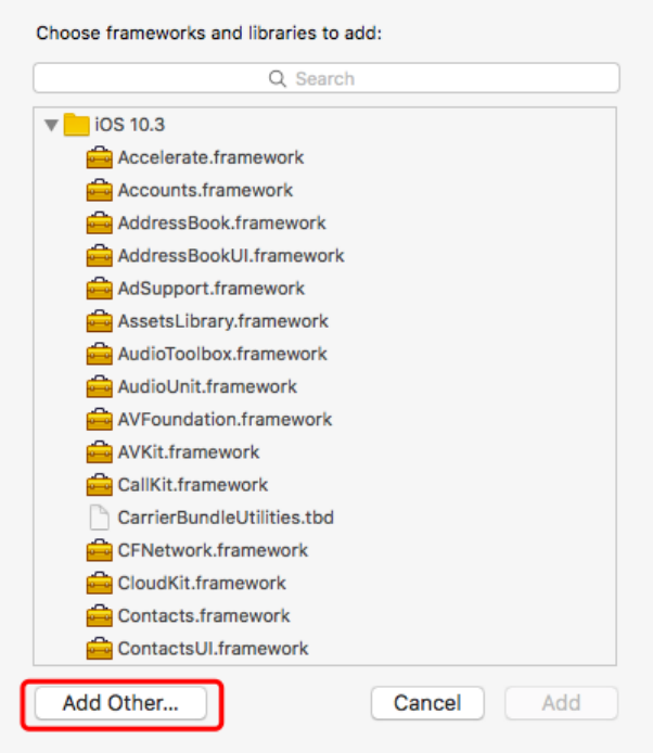 TARGET -> Build Phases -> Link Binary With Libraries¶
