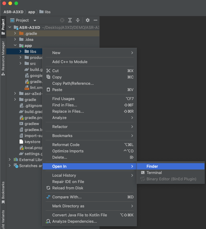 navigate to “app” → “libs”, right-click, and select “Open in Finder.”