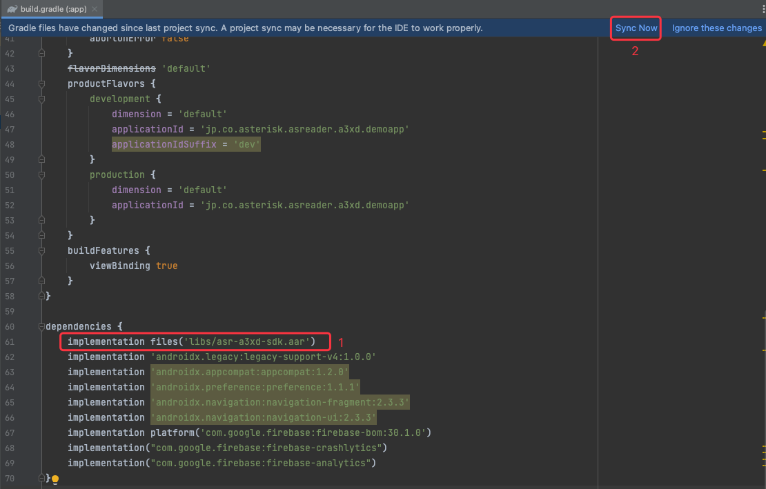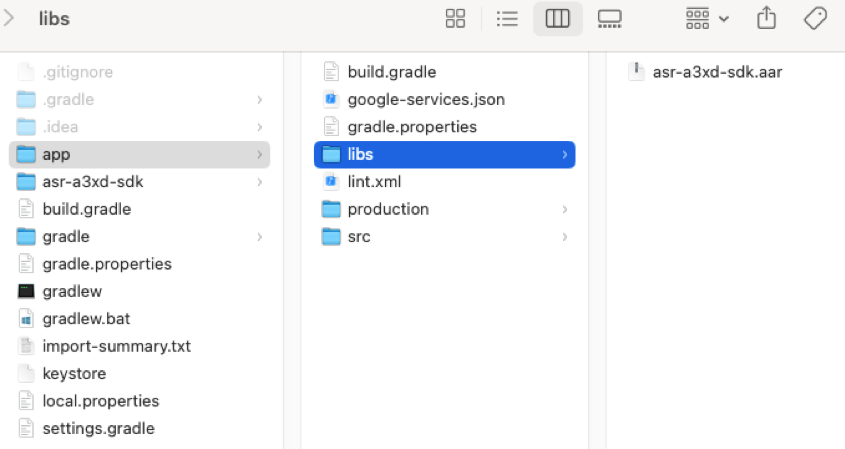 After pasting, you should seeasr-a3xd-sdk.aarlisted under “libs.”Add the library to the dependencies section.